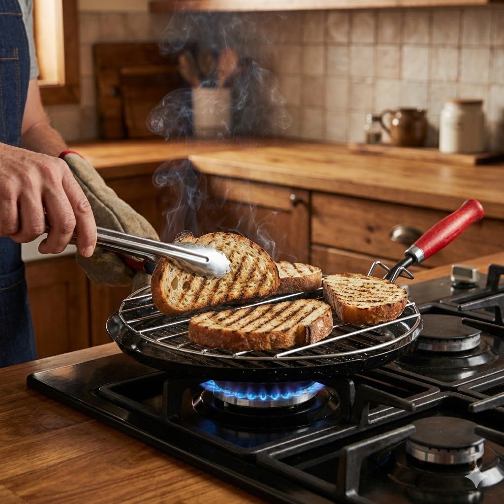 Lo que hace especial a este asador con parrilla esmaltado es que no se limita solo a la carne o el pescado. En GarHome sabemos que muchos de nuestros clientes lo buscan por un motivo muy concreto: tostar pan de forma tradicional. Al retirar la parrilla superior, la base de acero esmaltado se convierte en la superficie ideal para dorar rebanadas de pan de hogaza, consiguiendo ese tostado uniforme, crujiente por fuera y tierno por dentro que solo se logra con el calor directo del acero vitrificado.