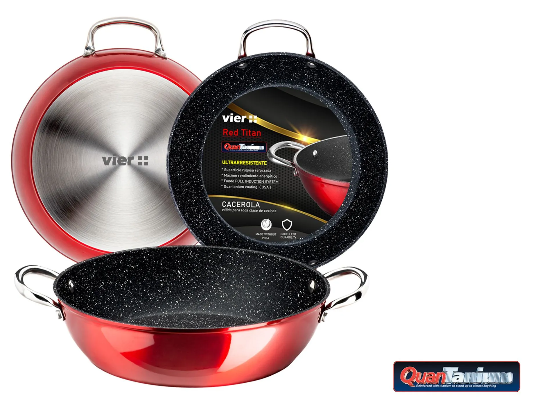 En GarHome seleccionamos la serie Red de Vier porque el aluminio forjado representa la evolución del menaje moderno para quienes no quieren complicaciones. A diferencia del aluminio prensado básico, el forjado se somete a presiones altísimas que compactan el metal, eliminando burbujas de aire y creando una estructura extremadamente densa. Esto significa que tienes una cacerola que conduce el calor con una eficiencia asombrosa, algo vital cuando hablamos de diámetros grandes como el de 32 cm, donde mantener la temperatura en los bordes suele ser un problema en cacerolas de baja calidad.