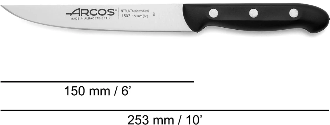 La serie de cuchillos Maitre está fabricada en acero inoxidable NITRUM®, con mangos de plásticos técnicos (PP) reforzados con remaches de acero inoxidable que aportan solidez y durabilidad. Su diseño ergonómico garantiza un agarre cómodo y seguro, ofreciendo precisión y resistencia en cada uso.