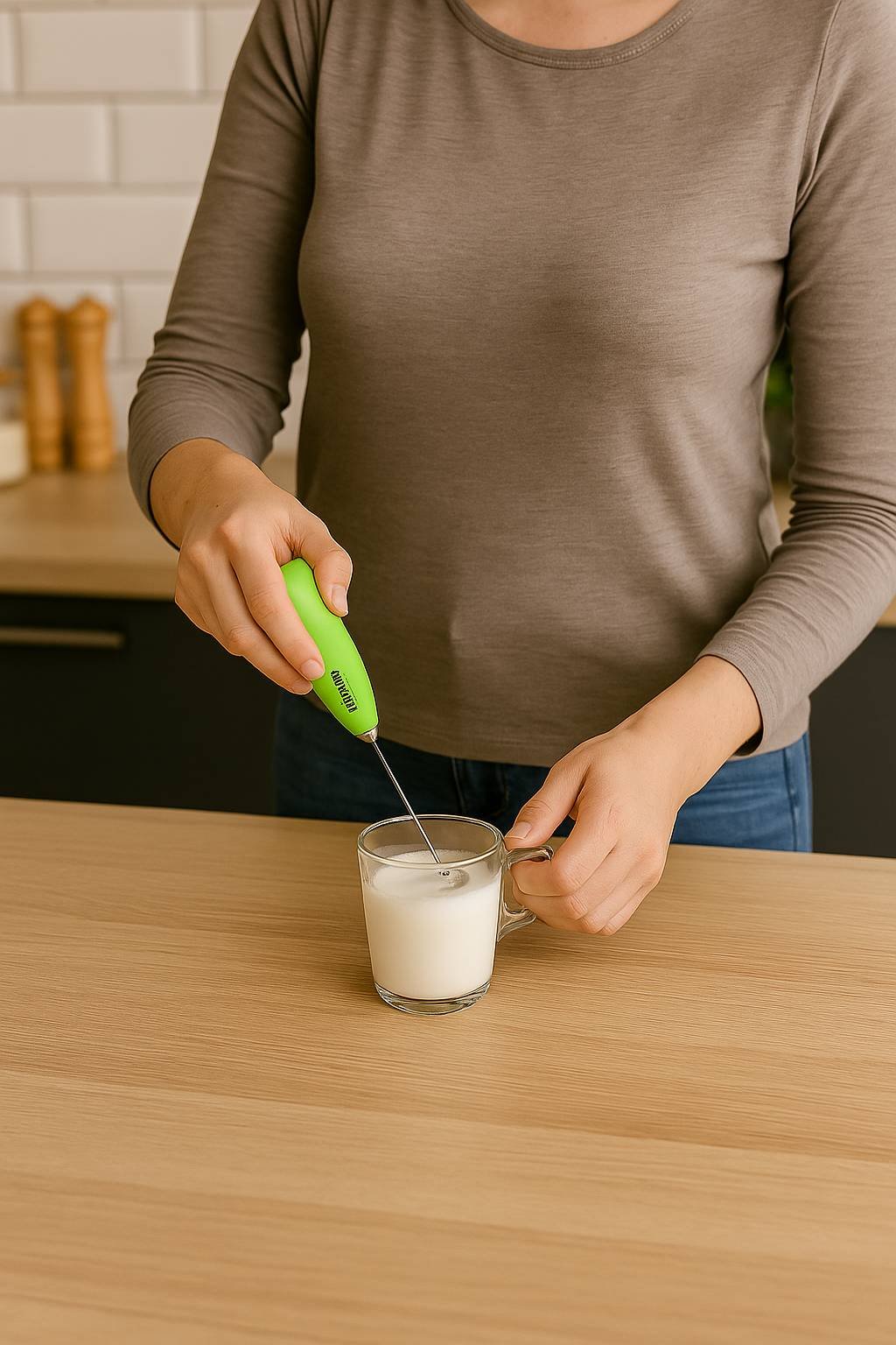 Batidor mezclador eléctrico LifeStyle, con varilla de acero inoxidable resistente, ideal para espumar leche, preparar batidos o mezclar té matcha. Funciona con pilas (incluidas) y ofrece un uso práctico y cómodo en la cocina.