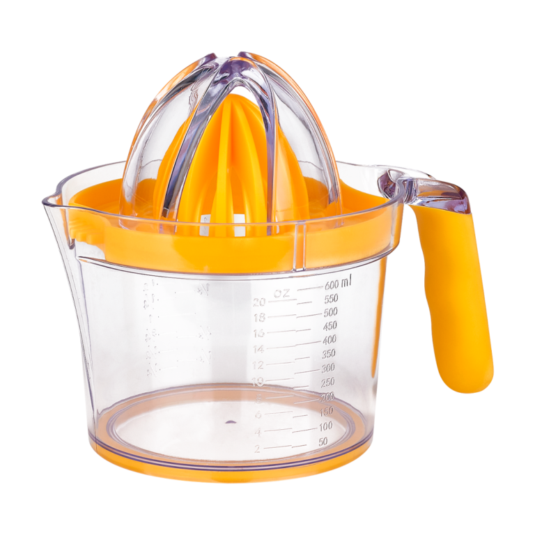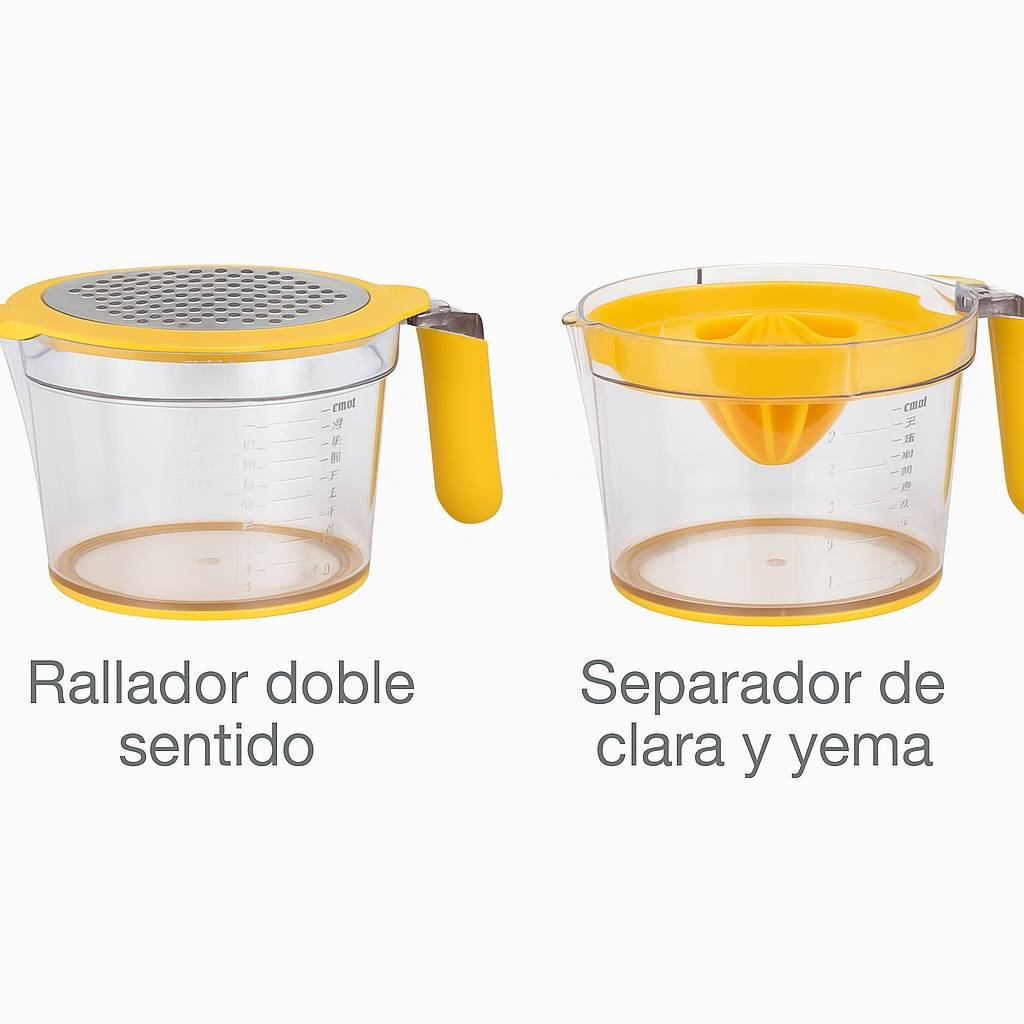 Exprimidor-jarra multiusos LifeStyle, un utensilio versátil con 4 funciones diferentes: exprimidor, jarra con medidor, separador de clara y yema y rallador. Todo en un solo accesorio práctico que ahorra espacio y facilita las tareas en la cocina.
