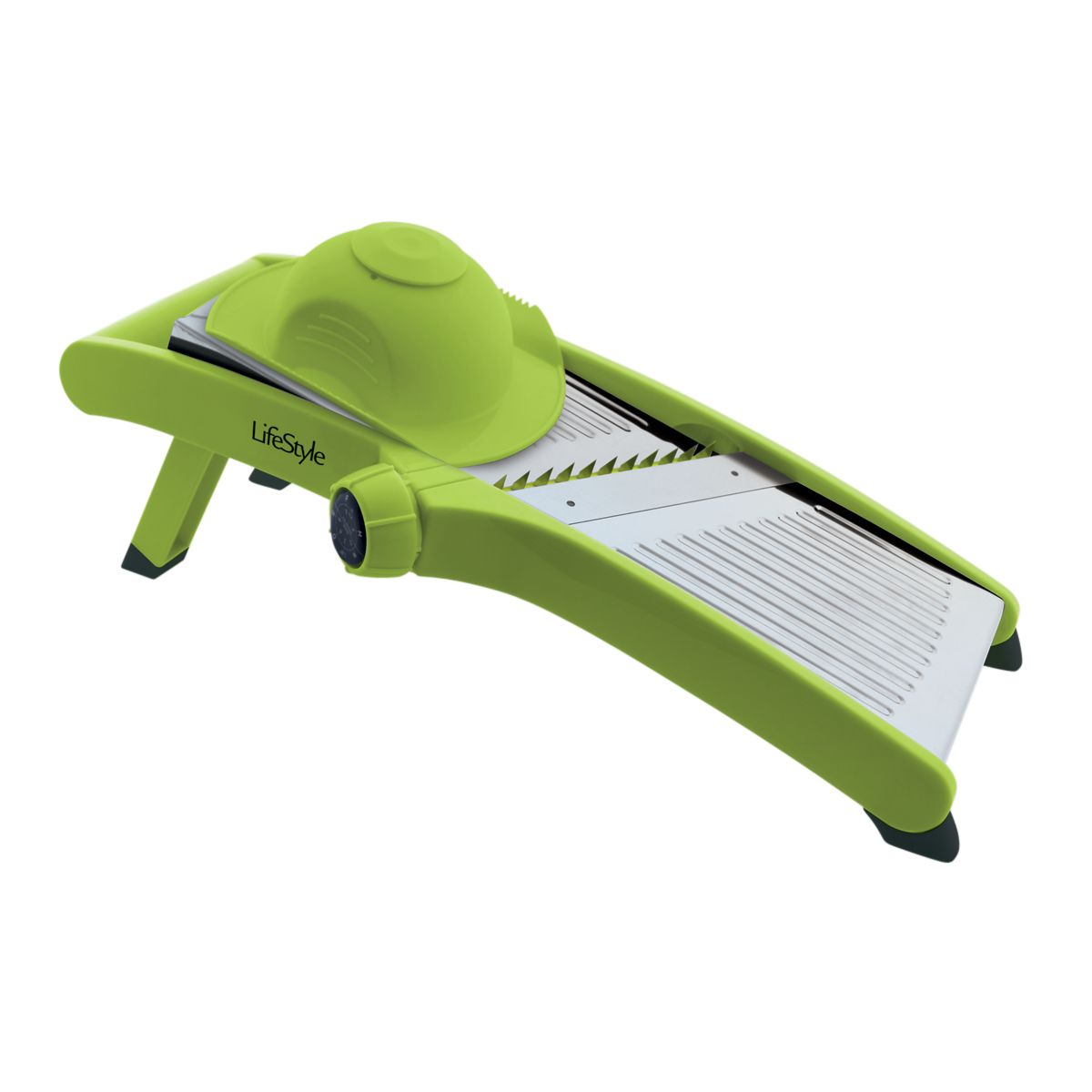 La mandolina LifeStyle cuenta con cuchilla de acero inoxidable y un regulador de corte de 0 a 9 mm, lo que permite realizar cortes en láminas o en juliana de distintos grosores. Incorpora mango de silicona para un agarre seguro y es de fácil desmontaje de las cuchillas, garantizando comodidad y precisión en la cocina.