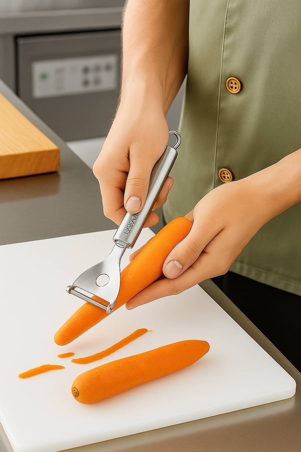 El pelador horizontal Platinum está fabricado en acero inoxidable de alta calidad, lo que garantiza durabilidad y resistencia. Su diseño ergonómico ofrece un agarre cómodo y seguro, ideal para pelar frutas y verduras con facilidad.