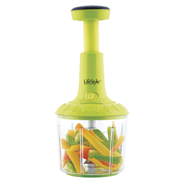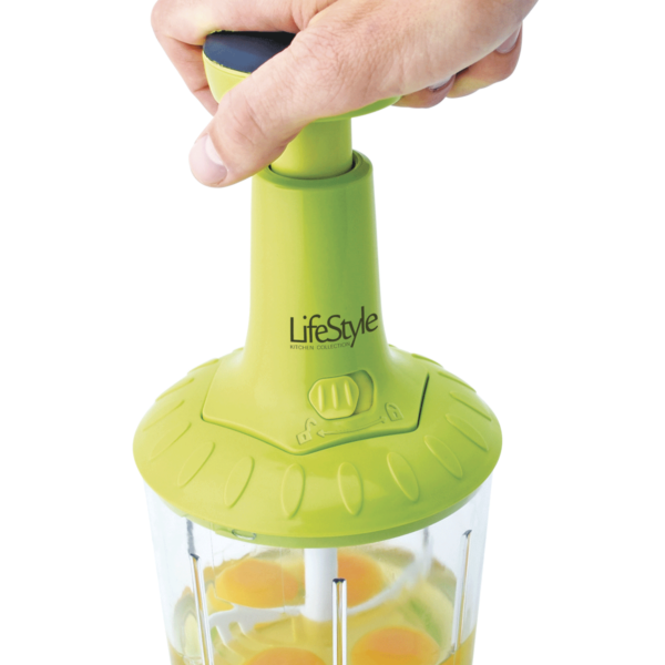 La picadora-batidora por presión LifeStyle tiene una capacidad de 1.000 ml (Ø13 cm x 22 cm bloqueada / 29 cm en uso) y cuenta con 5 cuchillas planas que ofrecen un corte uniforme en el 100% de la superficie. Incorpora eje metálico para mayor estabilidad e incluye pieza para batir, siendo una herramienta práctica y versátil para tu cocina.