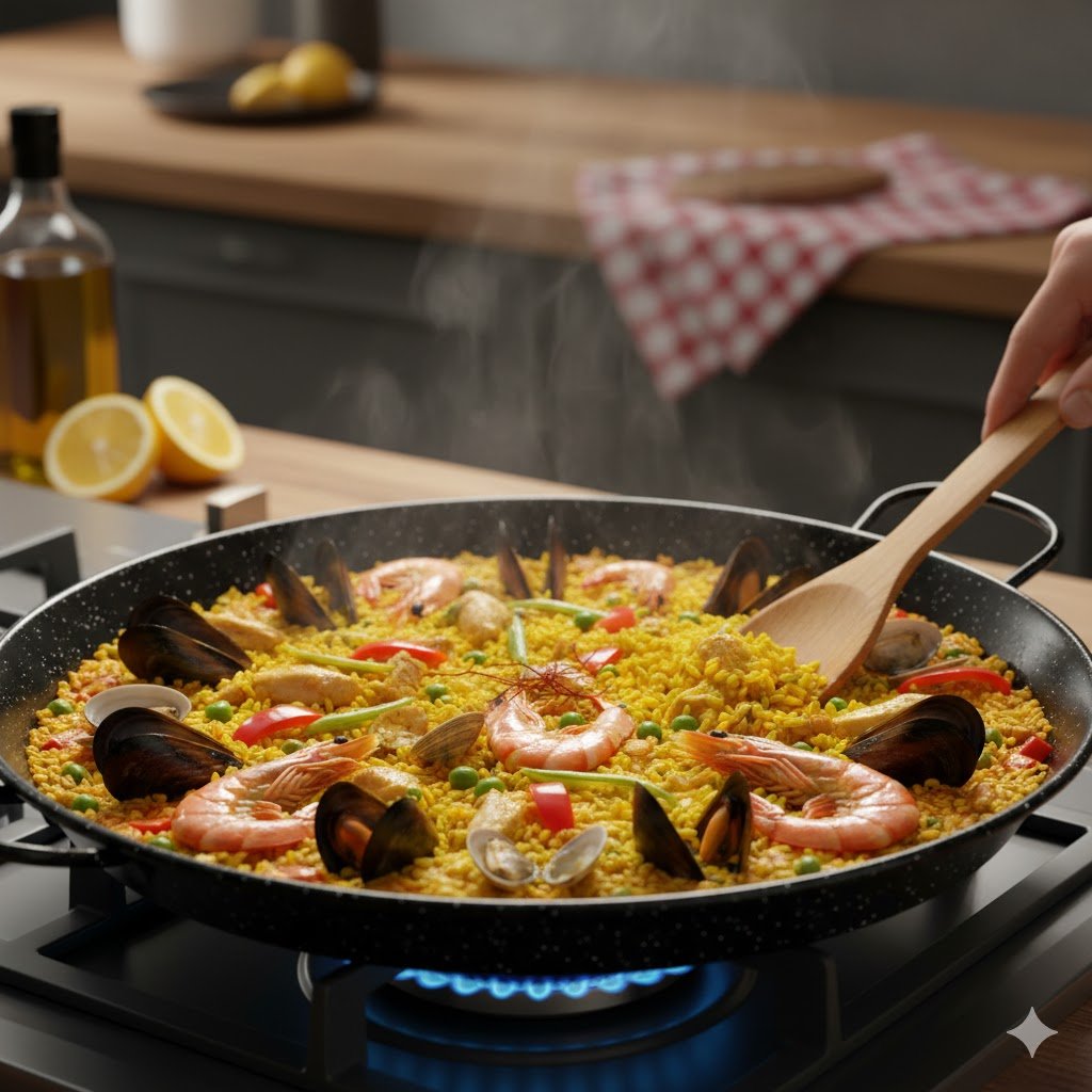 Utensilios: Aunque el esmalte es muy duro, usa cucharas de madera o silicona para que tu paellera valenciana esmaltada brille como el primer día durante años.