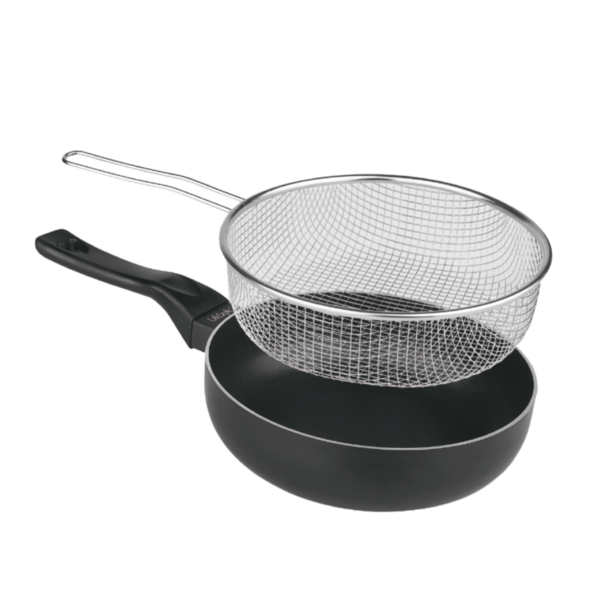 Esta sartén freidora LUXE está diseñada en aluminio de uso alimentario, con fondo profundo y un cestillo de acero inoxidable extraíble que permite freír con comodidad y menos aceite. Está disponible en varios diámetros (por ejemplo, 20 cm, 24 cm, 26 cm, 28 cm) según el modelo.