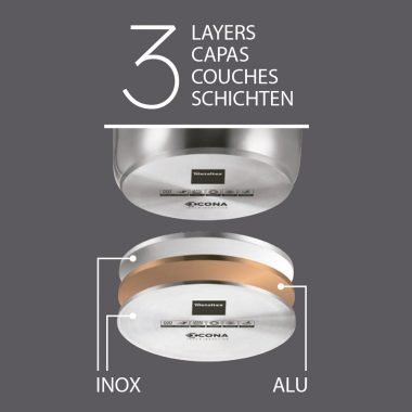 El secreto de la cocción perfecta en estas sartenes reside en su base técnica. La serie Icona incorpora un fondo de 3 capas encapsulado (Acero Inox / Aluminio / Acero Inox) con un espesor real de 5 mm.